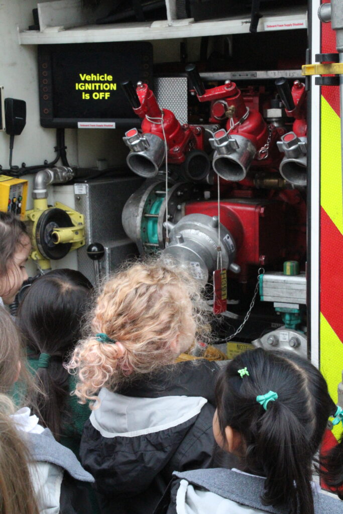 The children were invited to take a closer look at the fire truck and explore the many tools and pieces of equipment stored inside. The firefighters patiently explained what each item was used for – from the heavy hoses that spray water to the helmets, and protective gear that keeps them safe while tackling fires. The children were fascinated to see how everything had a special purpose.